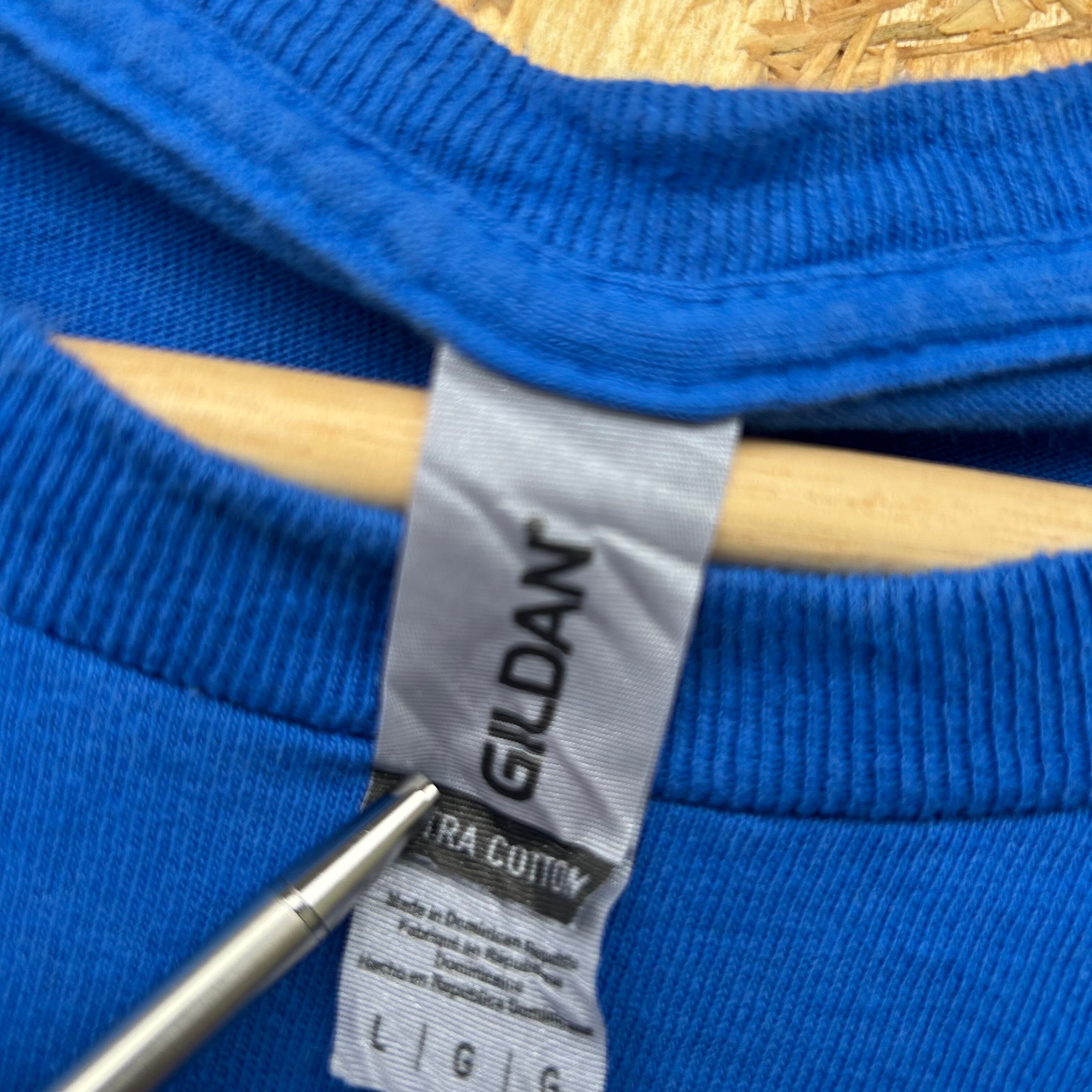 ギルダン GILDAN Tシャツ ロゴ バックプリント アメリカ古着 ブルー L アメカジ キャンプ アウトドア